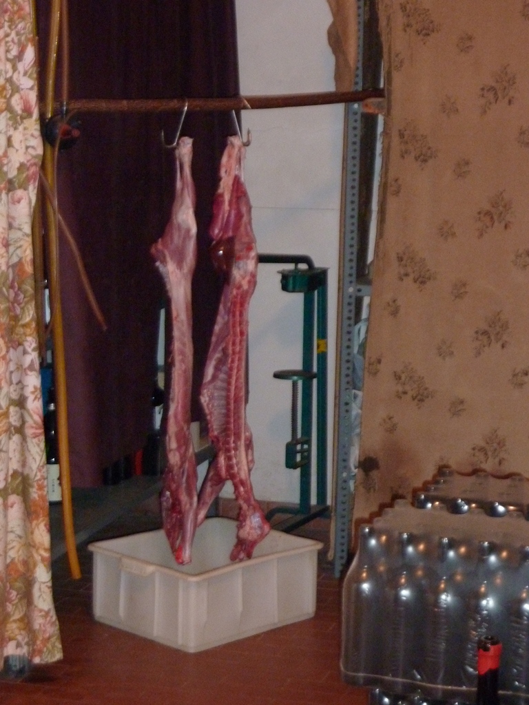 仔ヤギ一頭がみごとにつるされている。しかも私たちもワイン棚に、、、とっても『ぐるぐる』した光景です。